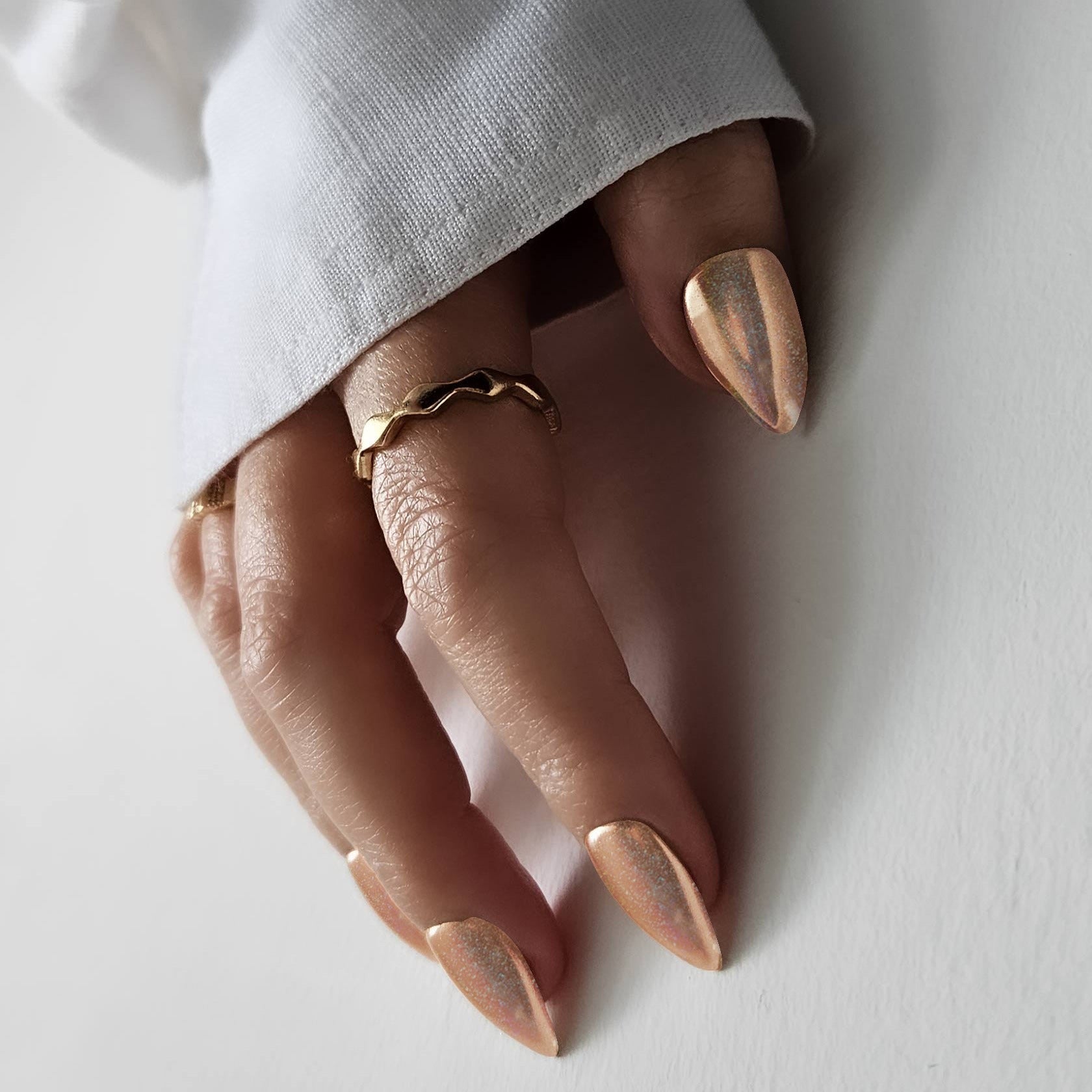 A holographic chrome, Bronzed has a burnished bronze base shade with an iridescent, spectrum finish.