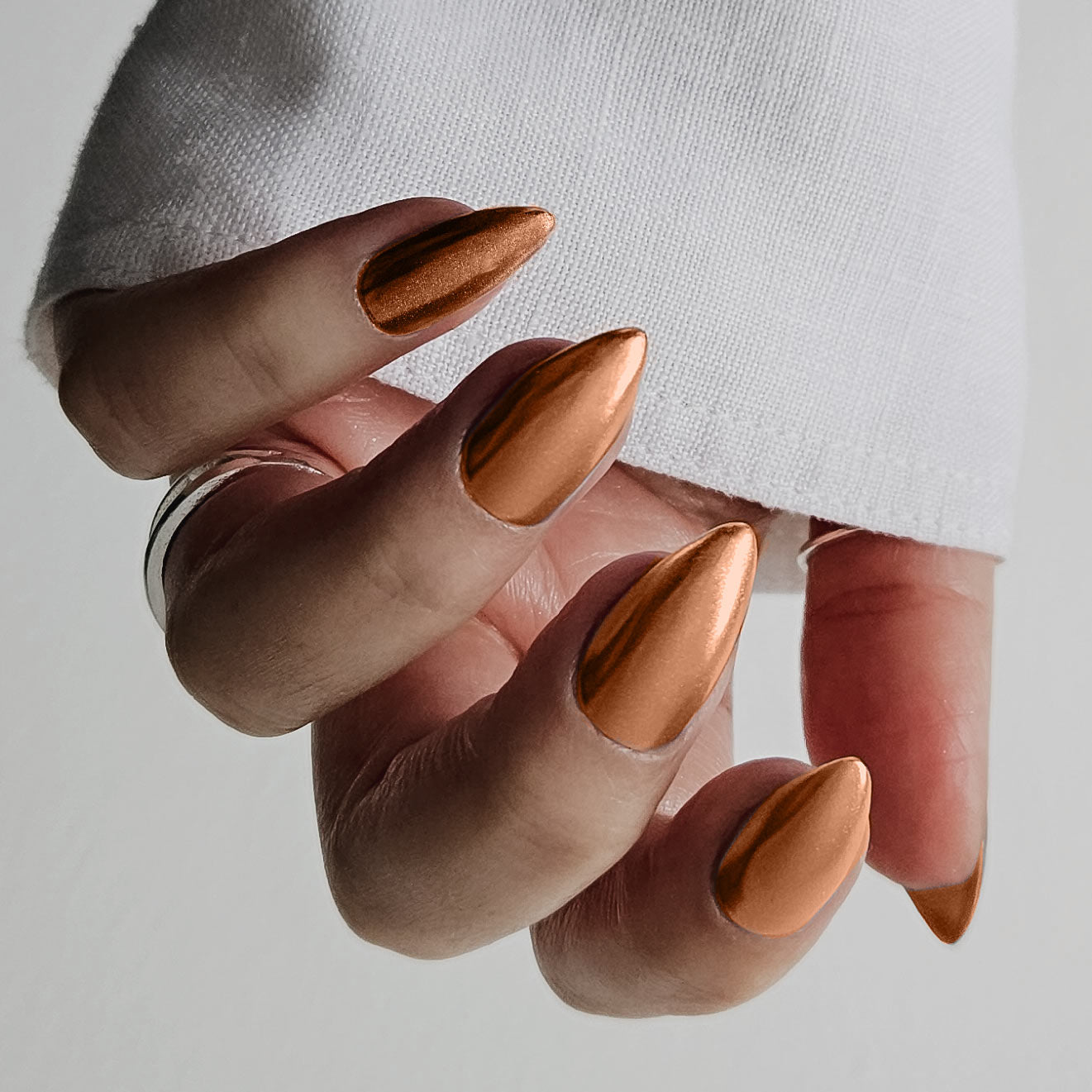 A muted copper chrome that gleams like a newly-pressed penny coin. Pair with deep browns for a rich, decadent look.