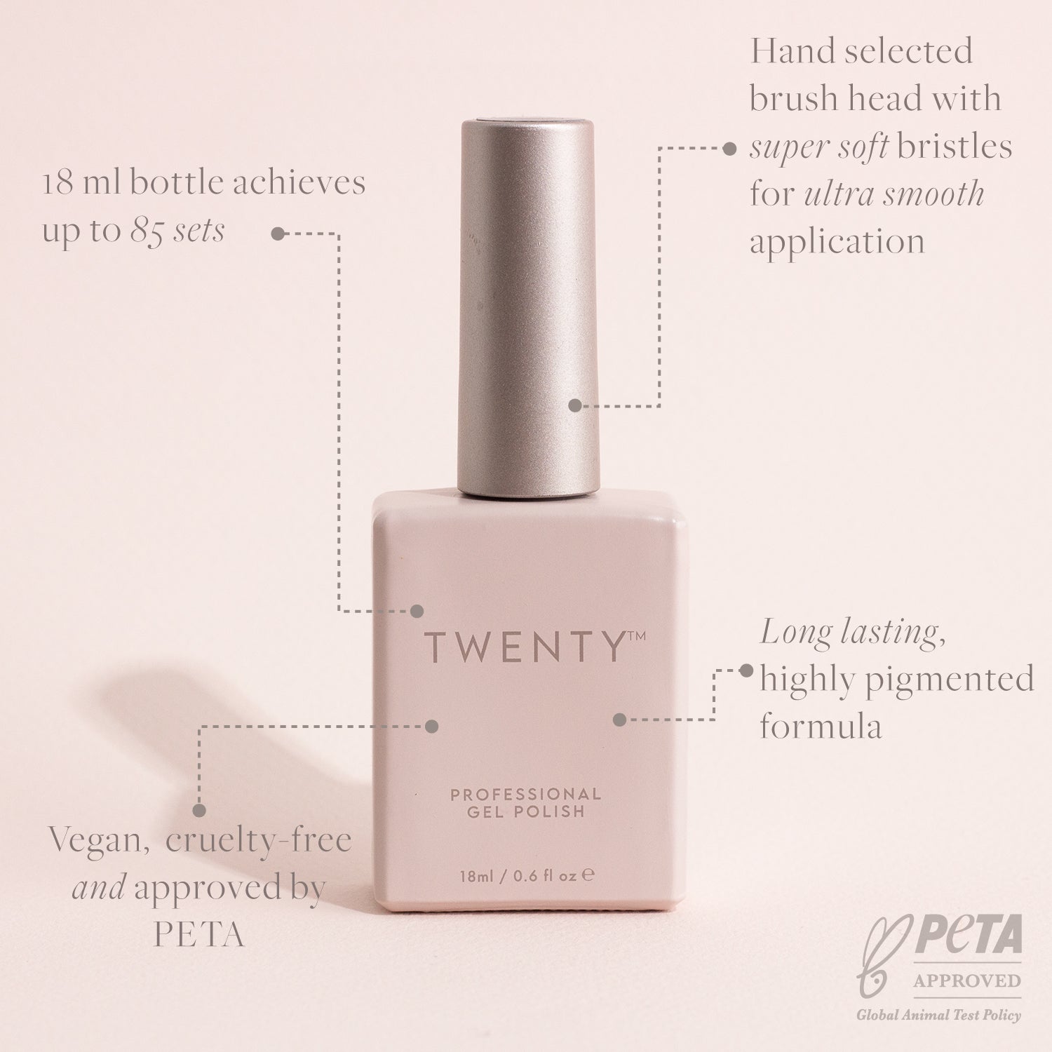 Use with a TWENTY™ base coat and top coat to ensure the gel application is complete.