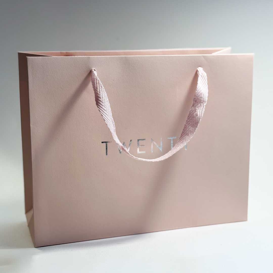 A luxe finishing touch for retail or training. Featuring a soft-touch blush finish, silver foiled TWENTY logo, and woven handles, this premium gift bag is perfect for presenting salon retail items like cuticle balms or files in style.